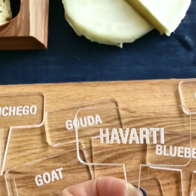 Ці прозорі таблички створюють ефект «парячого тексту». Біле лазерне гравіювання на кристально чистому акрилі виглядає стильно і читабельно на тлі будь-якої текстури — цвіль Камамбера, жовтизна Чеддера або темна скоринка витриманих сирів.